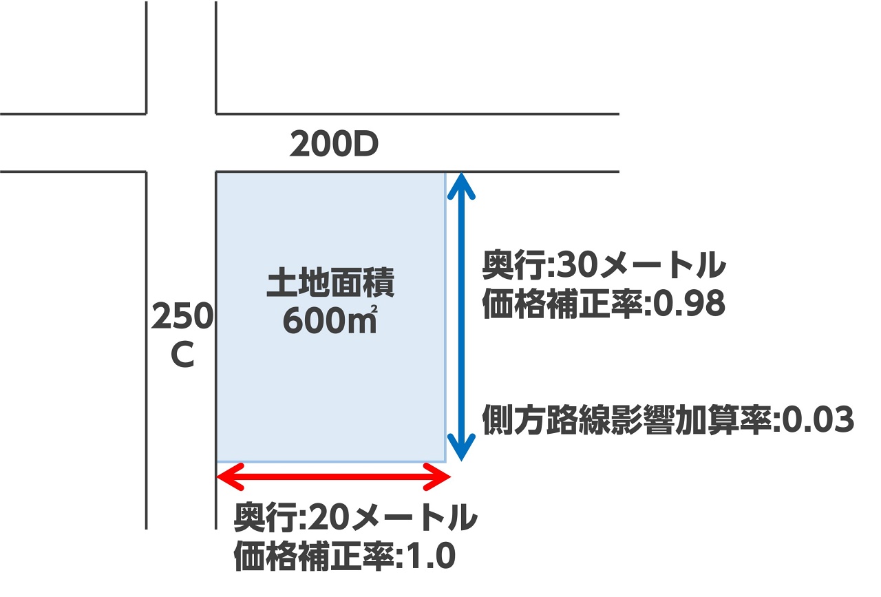 また今回は、角地のケースで計算しており、その時の側方路線影響加算率は0.03になります。